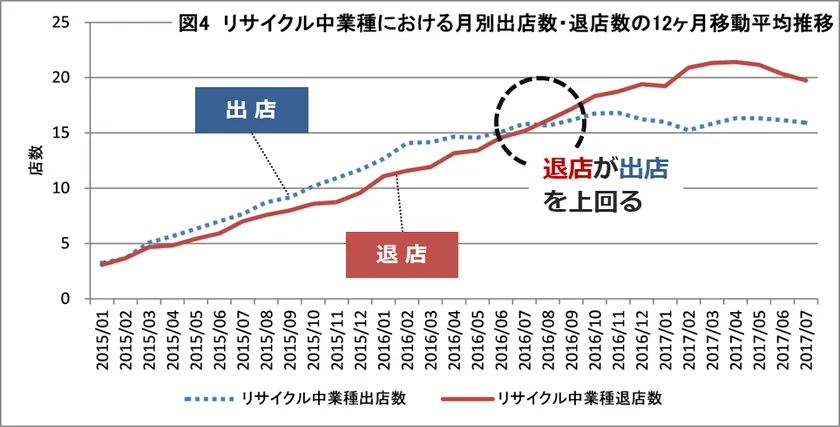 図4(リサイクル中業種における月別出店数・退店数の12ヶ月移動平均推移)