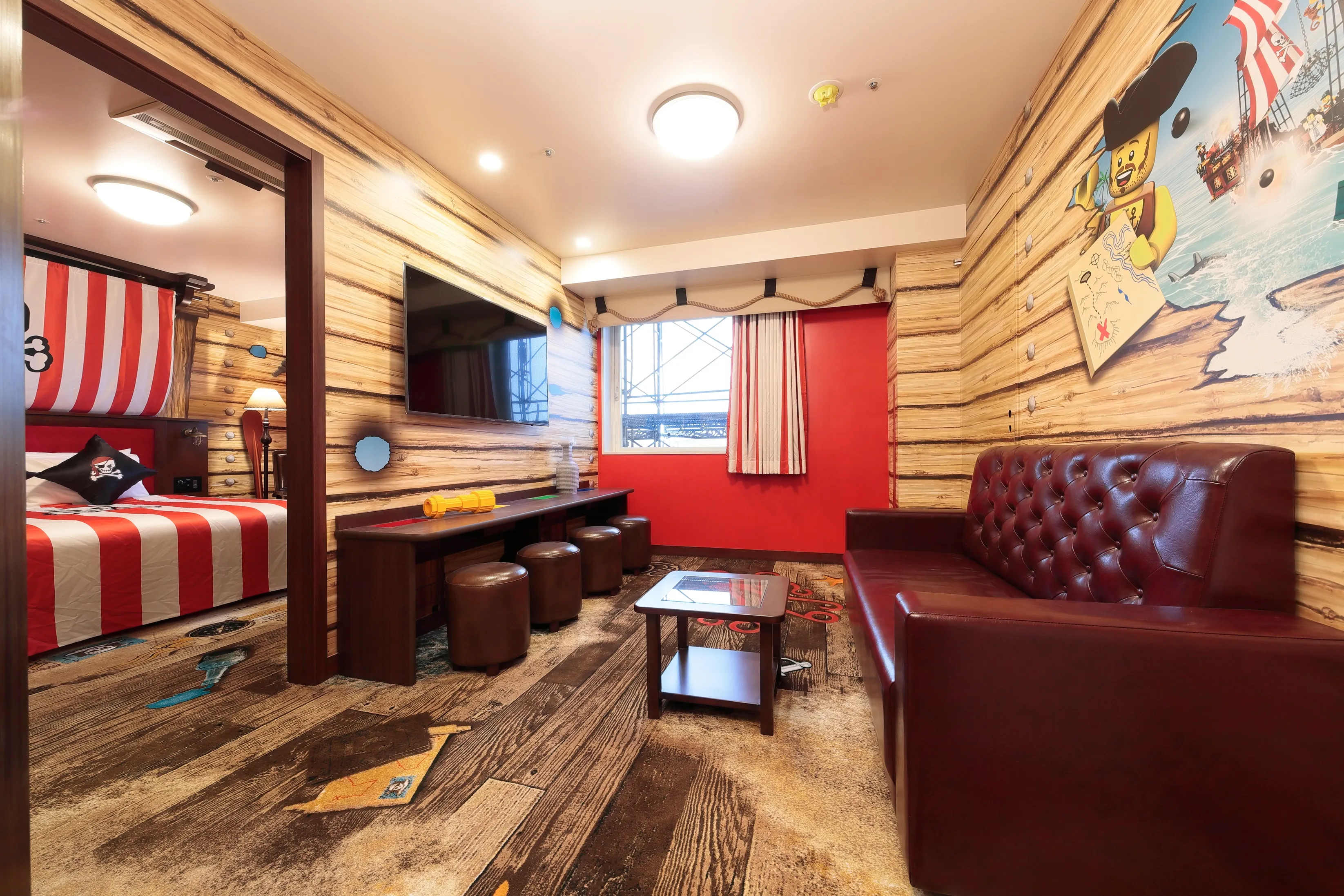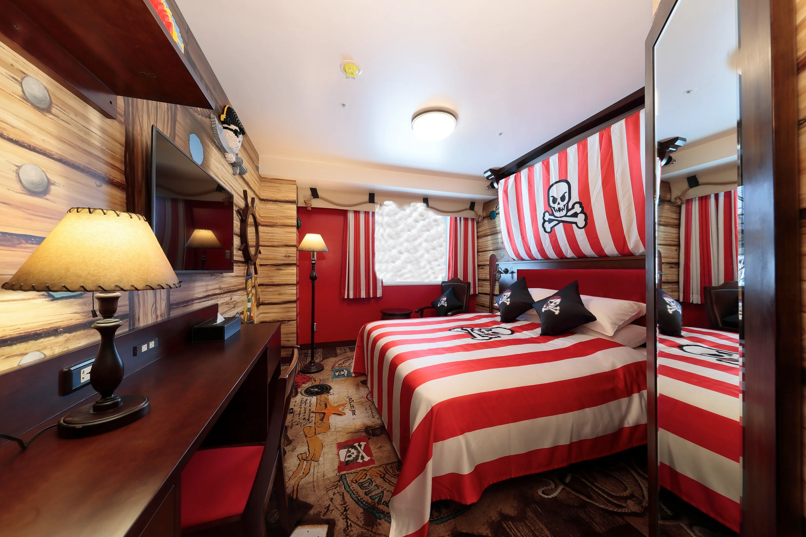 パイレーツをテーマとした客室階です。 ホテルの自分の部屋で世界の海を探検し、海賊の壁や宝の地図が書かれているじゅうたんをたどり、宝物を発見して家に持ち帰る準備はできているかい?さあ仲間たち、海賊旗をたなびかせて海賊部屋を予約しよう。