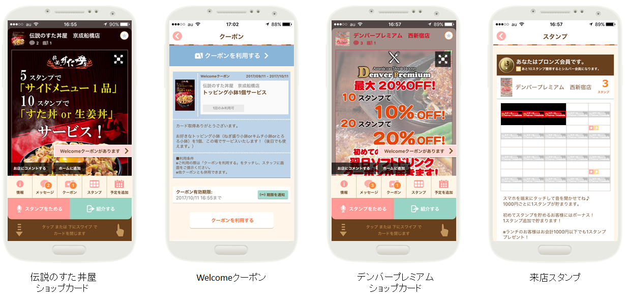 オペレーションの簡易化や、直接会員様へクーポンをお届けできることから、2016年7月「デンバープレミアム」に“Zeetleポイントカード”を試験導入しました。その後「伝説のステーキ屋」、「き久好」で導入し、今回「伝説のすた丼屋」に全店導入決定。12月1日(金)に4業態、111店舗でのサービスが開始することになりました。