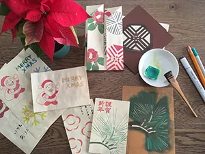 和紙のポストカードにお好きな型絵を使ってクリスマスカード・年賀状をつくります。
