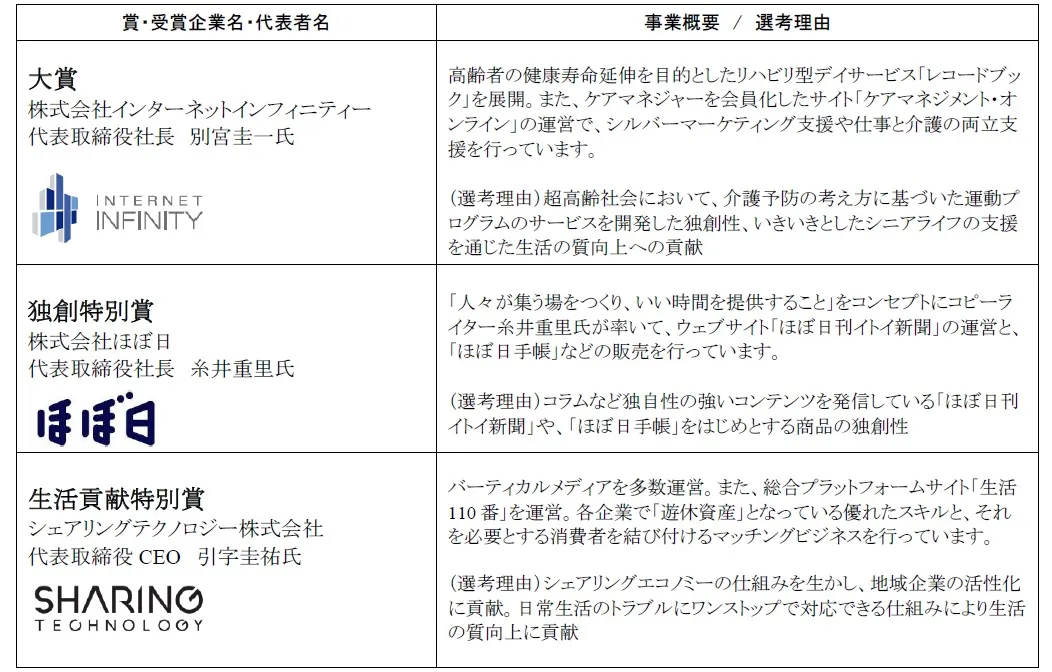 「大賞に輝いたインターネットインフィニティー社は、軽度の要介護者を対象に運動プログラムを行うデイサービスを通して、高齢者の心も体も元気にする事業を展開しています。超高齢化社会がせまるなか “健康寿命の延伸”という、我が国の課題解決につながるサービスであることが受賞のポイントになりました。 “ライフ イノベーション アワード”は、よりよい暮らしの実現につながる工夫やアイデアによって生まれる価値に注目しています。人々の生活向上を目的としたイノベーションには大きな意義があります。本アワードを通じ、よりよい暮らしを支える仲間が刺激し合える場を提供し、今後の日本におけるイノベーションの創造・発展を支援し続けてほしいと願っています」