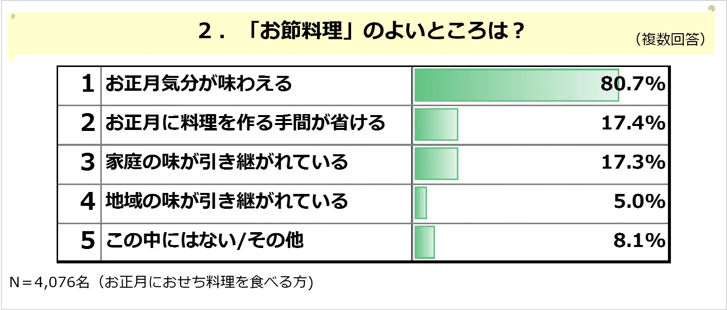 ■おせち料理のよいところは、なんと言っても「お正月気分が味わえること」が80.7%がダントツであるが、「お正月に料理を作る手間が省ける(17.4%)」や、「家庭の味が引き継がれている(17.3%)」や「地域の味が引き継がれている(5.0%)」など、基本的におせち料理を食べる人は減少傾向であるが(問1)、日本古来の習慣や、食文化によさを感じている人は多い。