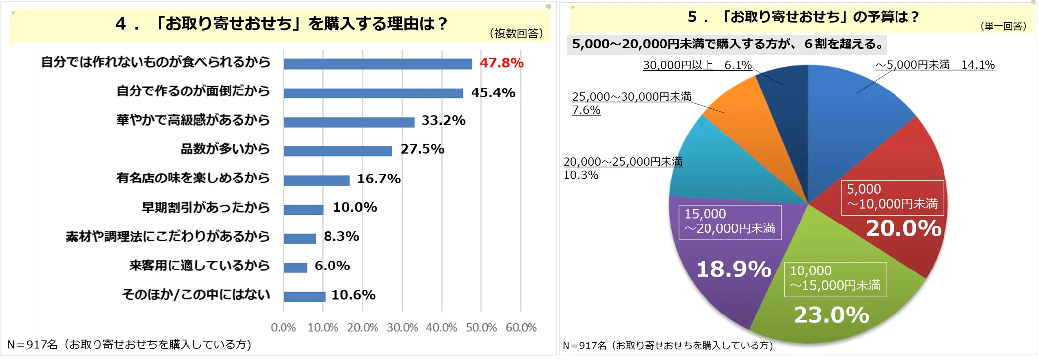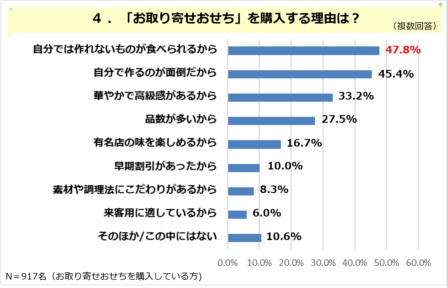 次からは、お取り寄せおせちを購入している方(N=917名)に、購入する理由や予算、購入場所について聞きました。