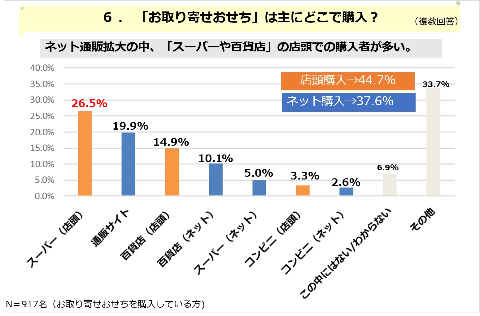 ■お取り寄せおせちの購入業態は、「スーパー(店頭)」が26.5%、「通販サイト」が19.9%、「百貨店(店頭)」が14.9%と続き、ネット通販が拡大する中、全体的にみて店頭での購入者がネット購入者を上回る結果となった。