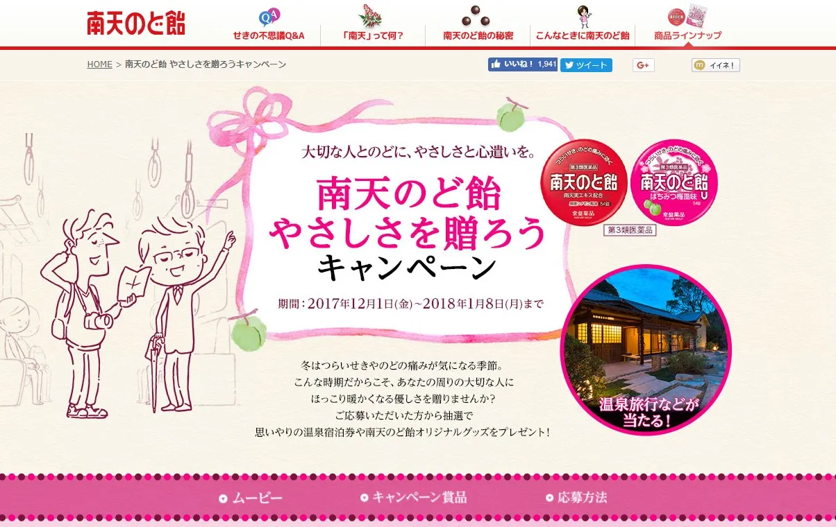 冬はつらいせきやのどの痛みが気になります。『南天のど飴』では、こんな時期だからこそ、周りの大切な人に暖かくなる優しさを贈りたいという想いのもと、“南天のど飴やさしさを贈ろうキャンペーン”を実施します。