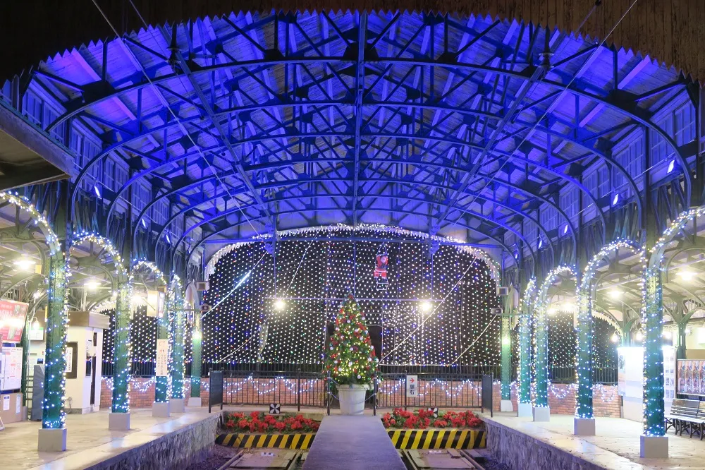 開業当時の趣を今に伝えるドーム屋根の駅舎が残る八瀬比叡山口駅。その駅舎をイルミネーションすることにより、やさしい光に包まれた空間を感じていただけます。