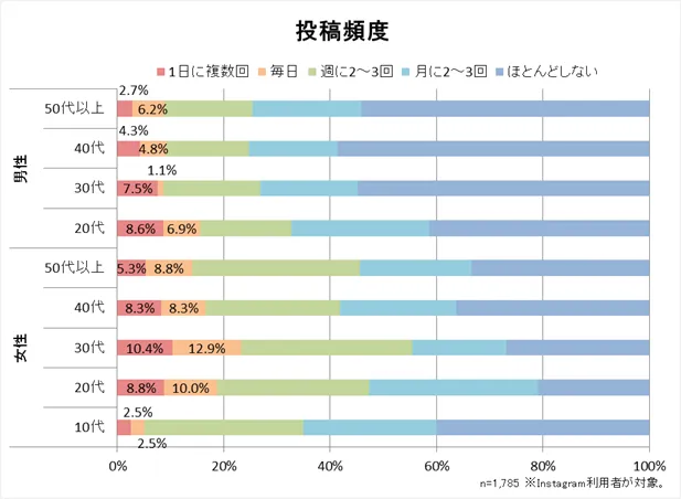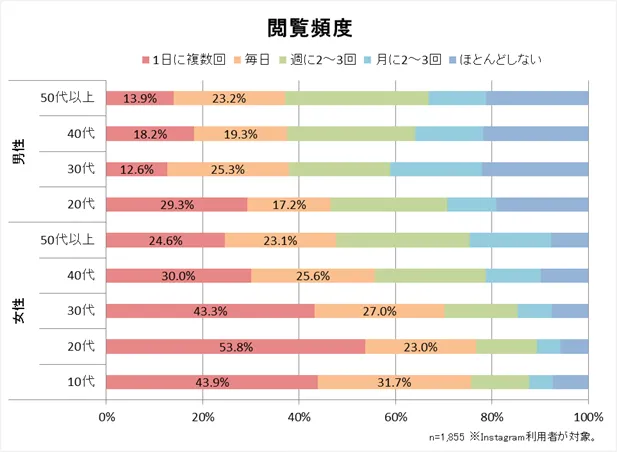 「投稿は、どのくらいの頻度で行いますか?」という質問では、30代女性の20%以上が「毎日(1日に複数回を含む)」と回答。10代女性は「毎日」と答えた人が5%となっていますが、「閲覧は、どのくらいの頻度で行いますか?」という質問には「毎日」と回答している人が約75%おり、若い世代の女性ほど「情報発信(投稿)」より「情報収集(閲覧)」にInstagramを活用していることが窺えます。また、男性でも投稿を「毎日」する人が10~15%、閲覧を「毎日」する人が40%程度おり、男性にもInstagram活用が広がっていることが分かります。