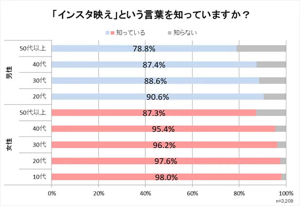 「インスタ映え」という言葉を知っている人は91.8%にものぼります。女性はどの世代も90%に近い数値となっており、女性の認知率は非常に高いと言えます。男性は50代以上になると80%以下に減ってしまいますが、40代以下では90%に近い認知率があります。