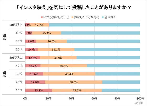 「インスタ映えを気にして投稿したことがありますか?」という質問に対し、10~30代女性の60%以上は「インスタ映え」を気にして投稿した経験があるようです。「いつも気にしている」が10代女性では23.1%、20~30代女性でも17.0%おり、日常的に「インスタ映え」を意識して投稿していることが窺えます。また、男性も「インスタ映え」を気にして投稿した経験がある方が意外に多く、20~30代男性では40%前後、40代男性では約30%が「インスタ映え」を気にして投稿した経験があるようです。