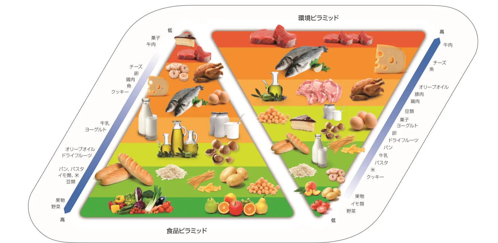 プラテージは、バリラが提唱する人間の健康を支える必要な栄養素と、農林水産物の生産における環境負荷のバランスを具現化した「ダブルピラミッド」を考案した人物であり、この「ダブルピラミッド」は、日本の食事バランスガイドのように、イタリアの健康的な食生活の啓発活動において、広く浸透されているものです。(下記図参照)