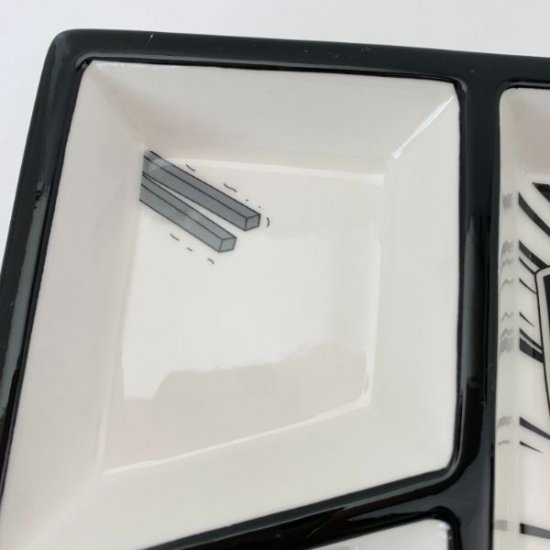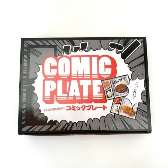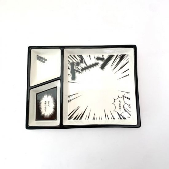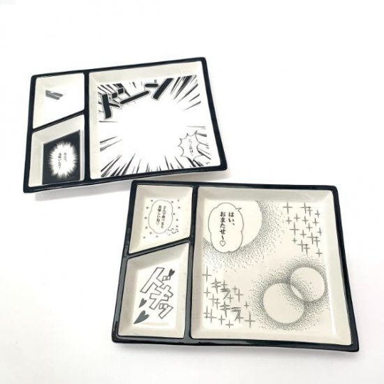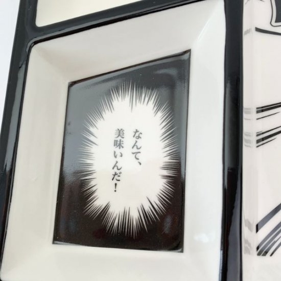 こちらがマンガプレートです。プレートをマンガに見立てるなんてすごいアイデアですよね♪でもたしかにプレートの仕切りってマンガのコマのように見えます。フチ部分が黒くカラーリングされているので、マンガ感がより強調されていますね♪