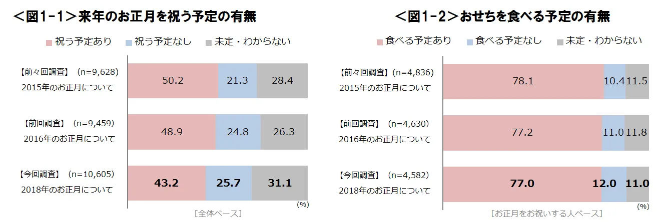 ●来年のお正月を祝う予定のある人は全体の約4割。前回・前々回の調査と比較して、祝う予定がある人が減少していることが判明。おせちを食べる予定のある人は前回・前々回調査と比較して大きな変化はないものの、微減している。<図1-1,図1-2>