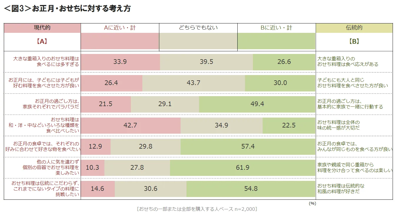 ●お正月やおせちに関する考え方では、過半数の項目で伝統的な志向より現代的な志向に近い人が多い。しかし、「家族や親戚で同じ重箱から料理を分け合って食べるのは楽しい」は、「他の人に気を遣わず個別の容器でおせち料理を楽しみたい」を上回り、おせち料理において「個食」を好む層は一部にとどまるとみられる。<図3>