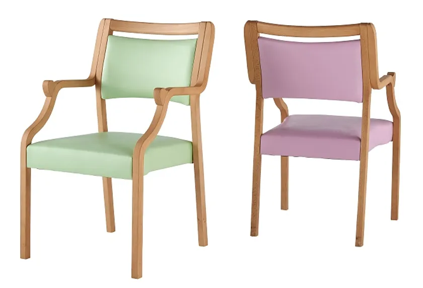 当社が手がけている介護施設の共用空間向けのスタッキングチェア(普及タイプ)の常時在庫品は、(1)天然木ビーチ材使用の軽量タイプ(全肘/品番:S2)、(2)天然木積層合板ラバーウッド使用(半肘/品番:C1)、(3)同(全肘/品番:C2)とを有し、いずれも木部フレーム2色×座面カラー4色(計8アイテム)を品揃えし、対応しております。