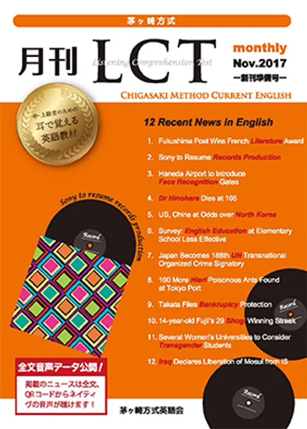 そこで2018年1月、『月刊英語教本』に代わる月刊誌『茅ヶ崎方式 月刊LCT(Current News in English)』を新創刊いたします。雑誌名のLCTはListening Comprehension Testの略称です。音声データはQRコードで提供いたします。
