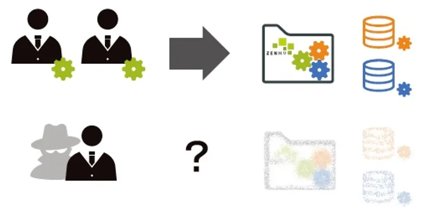 ZENMU for Meisterは、「システム管理」と「情報管理」を明確に分け、アドミニストレータやルート権限などの特権IDを持つシステム管理者でもデータにアクセスできない「見えない金庫」により情報のオーナーが承認したユーザーだけが情報にアクセスできるソリューションです。