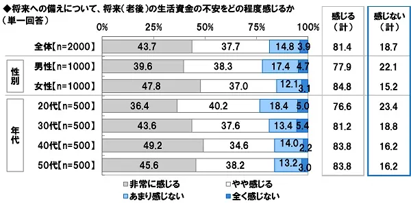 さらに、年代別にみると、20代では『感じる(計)』が76.6%、30代では81.2%、40代と50代ではともに83.8%となり、30代、40代と年代が上がるにつれ、将来の生活資金の不安を感じる方が増えていることがわかりました。