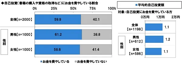 全回答者(2,000名)に、キャリアアップのための【自己投資(書籍の購入や資格の取得など)】について、お金を費やしているか、費やしている場合はその金額を聞いたところ、「お金を費やしている」割合は59.9%となり、自己投資をしている方(1,198名)の平均自己投資額は、ひと月あたり1.1万円となりました。