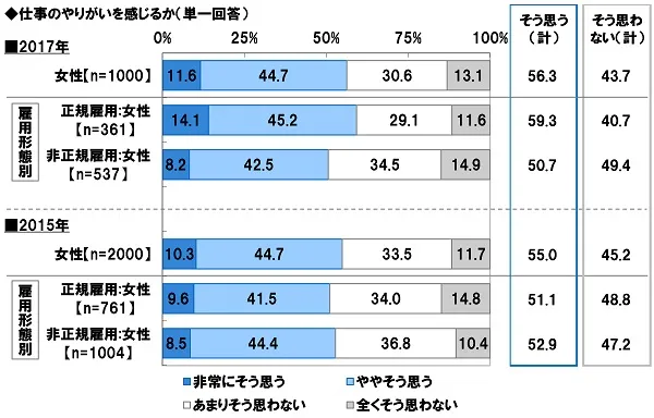 一方で、非正規雇用の女性では「やりがいを感じる」割合がやや減少(2015年52.9%→2017年50.7%)しました。非正規雇用の女性もやりがいを持って働ける職場づくりに向けた施策が課題といえそうです。
