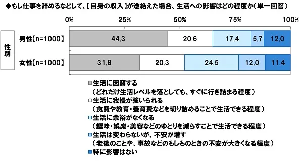 全回答者(2,000名)に対し、もし仕事を辞めるなどして自身の収入が途絶えた場合、生活への影響はどの程度か聞いたところ、女性(1,000名)の回答では、「生活に困窮する」が31.8%で最多回答となりました。自身の収入が途絶えたら生活が成り立たなくなるほど、家計に貢献している状況の就業女性が多いようです。