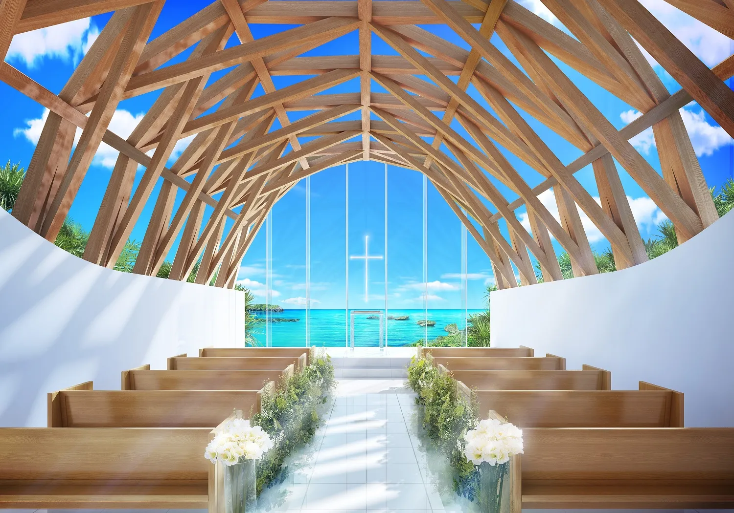 光が差し込むチャペル内のデコレーションには、生花を使用。祭壇には、目の前に 広がる美ら海・青い空と重なるように存在感あるクロス(十字架)がおふたりを見守ります。挙式中は神聖なヴァイオリンとオルガンによる厳かな音色の生演奏がチャペル内に響き渡り、上質な空間を演出します。