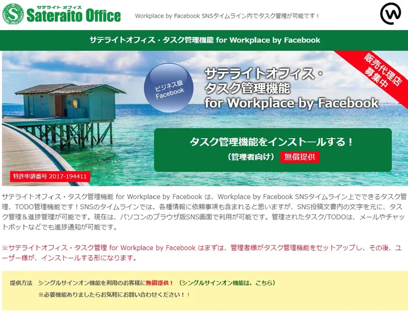 サテライトオフィスは、Workplace by Facebook 導入支援の中で、Workplace by Facebook で利用可能なシングルサインオン機能、ワークフロー機能、掲示板/回覧板機能、ドキュメント管理機能、CRM機能、タイムカード/勤怠管理機能、安否確認機能等を無償/有償提供しております。今回は、Workplace by Facebook 導入企業から要望が多かった、Workplace by Facebook とシームレスに動くタスク/TODO管理機能を開発し、当社開発のアドオンツール「シングルサインオン for Workplace by Facebook」の導入企業向けに無償提供します。