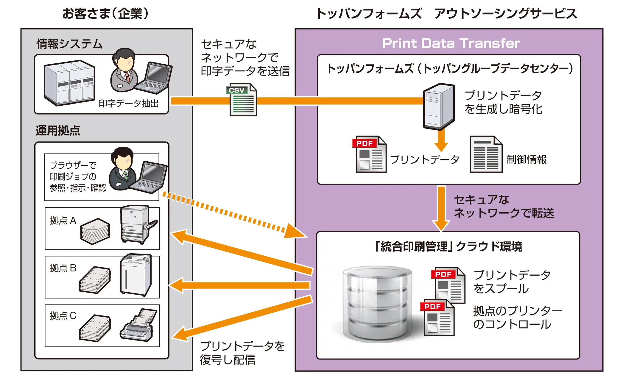 トッパンフォームズと日本電気株式会社(以下NEC)が共同開発した「プリント・データ・トランスファー」は、トッパンフォームズの「帳票生成基盤」で生成したプリントデータを、NECのクラウド基盤サービスにより構築した「統合印刷管理」クラウドにスプールし、お客さまの拠点プリンターでの即時印刷を可能にします。これによりプリントデータ生成・配信のアウトソーシングが可能となり、企業の帳票出力に関わるコストと労力を最適化します。