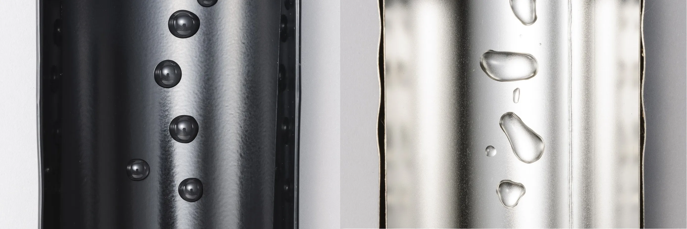 ボトル内面に水滴をかけた様子(左:セラミック塗膜加工あり、右:セラミック塗膜加工なし)