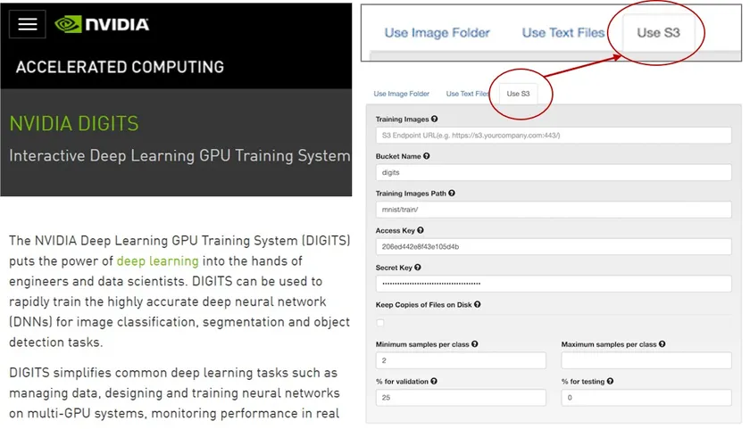 DIGITSは、画像分類、セグメンテーション、およびオブジェクト検知のために、高精度のディープニューラルネットワーク(DNN)を迅速にトレーニングできるソフトウェアです。GitHubにてソースコードが公開されていることから、クラウディアンは、その環境を使いDIGITSとS3互換オブジェクトストレージとの連携を可能にする開発を行いました。