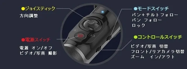 ■グリップ部分には操作性に優れたコントロールパネルがあります。スマホとコントロールパネルはBluetoothで接続され、ケーブルが撮影の邪魔になる事もありません。