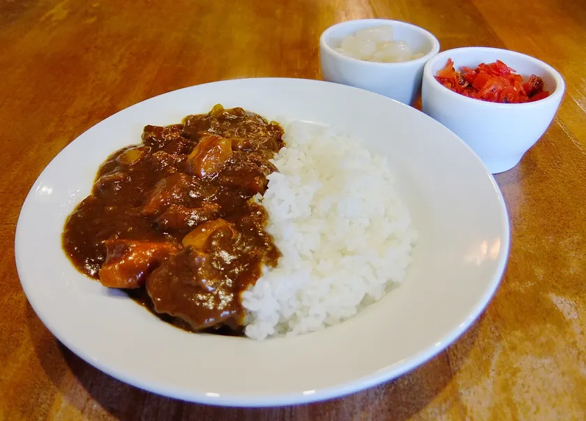 山岸 一雄が幼少の頃、海軍だった父親に連れられて食べた「海軍カレー」がベースになっています。豚肉、玉ねぎ、にんじん、ジャガイモをラードで炒め、5時間以上かけた大勝軒のラーメンスープとカレー粉で煮込むことで、魚介の奥行きとコクのあるカレーに仕上がっています。昭和の香りが漂う、懐かしくて優しい日本のカレーライス。