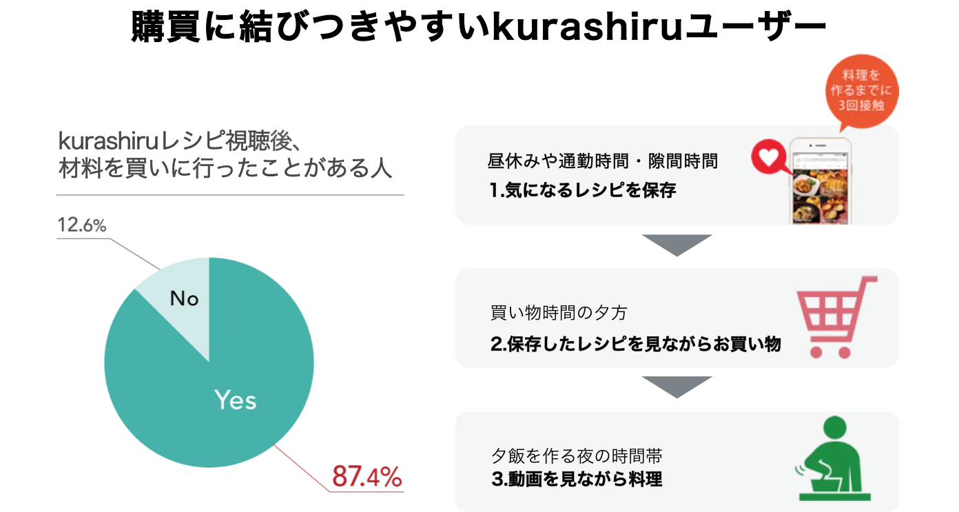 「PC→スマートフォン」へのデバイスの転換、「テキスト→動画」へのコンテンツの転換という2つの背景から、スマホアプリでのレシピ動画視聴が急増しています。その中でも当社サービス「クラシル」は、約90%のユーザーが動画視聴後に材料を買いに行くという結果が出ており、購買に繋がりやすいという特徴があります。