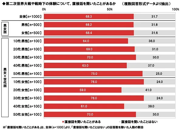 男女×世代別にみると、「直接話を聞いたことがある」割合が最も高いのは10代女性と30代女性(ともに76.0%)、最も低いのは20代女性(59.0%)だった。