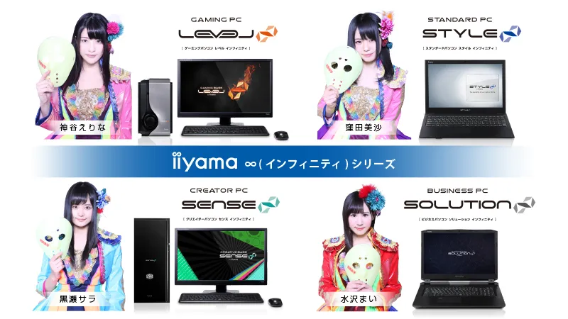 弊社が販売する、信頼のJAPAN QUALITY「iiyama PC」ブランド製品をより深く知って頂く為、仮面女子メンバーから選抜した“神谷えりな”、“窪田美沙”、“黒瀬サラ”、“水沢まい”の4名で結成される新アイドルユニット「無限女子 ~ powered by 仮面女子 ~」を結成。各選抜メンバーには、「iiyama PC」の各プロダクトブランド「インフィニティシリーズ」ごとのイメージガールに就任の上、今後の活動を通じて各分野をより多くのお客様に知って頂けるように活動を進めてまいります。