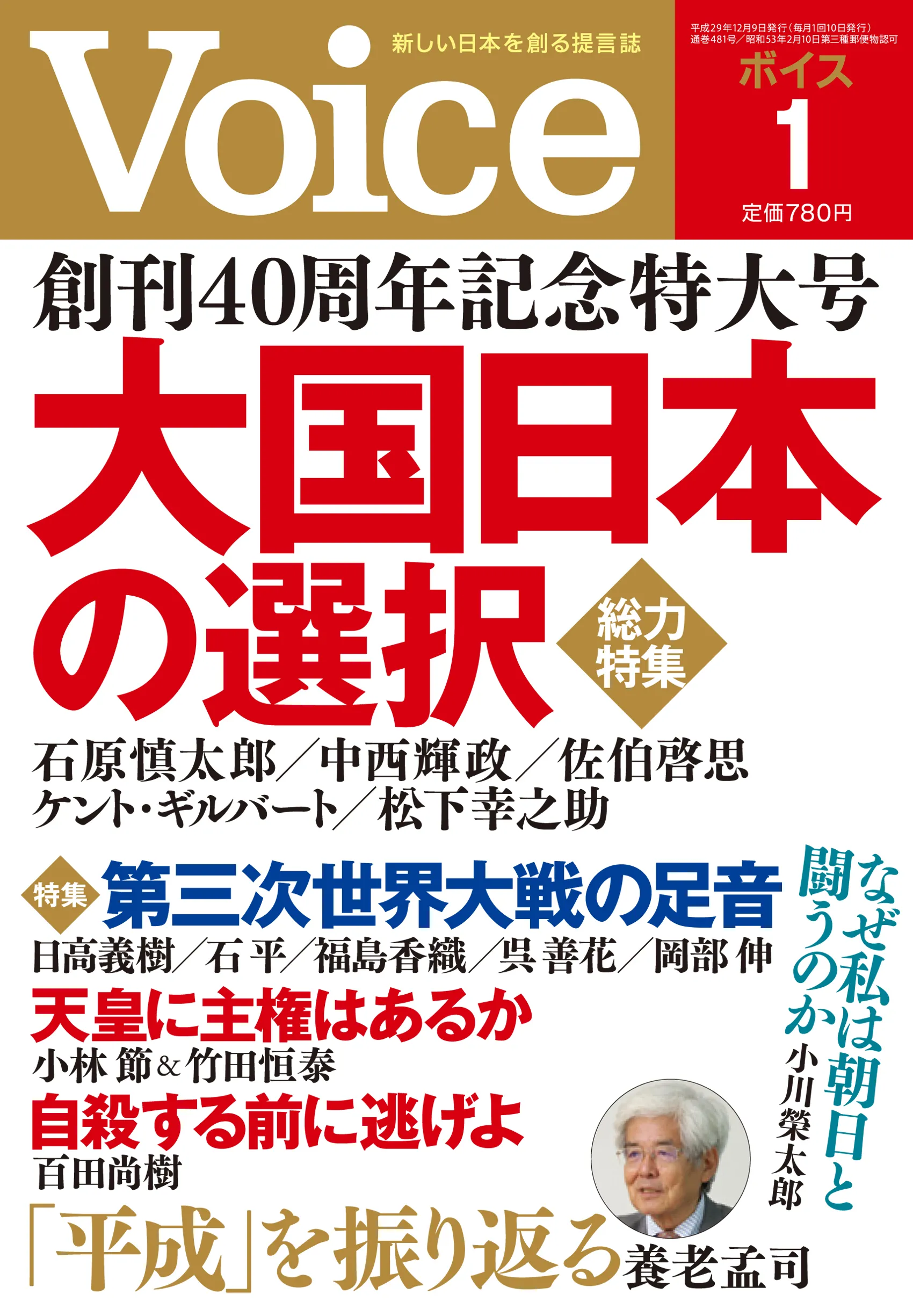日本と世界のあるべき姿を追求する月刊誌『Voice』(編集人:永田貴之、発行人:後藤淳一、株式会社PHP研究所)は、2018年1月号(2017年12月9日発売、定価780円)で、創刊40周年を迎えます。