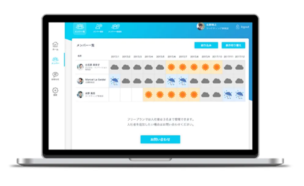 「HR OnBoard」を通じて、入社1年以内の社員が離職する兆候を可視化。具体的な対策をアドバイスします。毎月3問ずつ、1年間にわたって新卒・中途採用で入社した社員へ質問を送信。社員が月ごとのコンディションをオリジナルスタンプで回答することで、企業は「晴れ・曇・雨」で社員ごとに状況を把握することが可能になりました。離職リスクの早期発見、フォロー実施までつなげます。