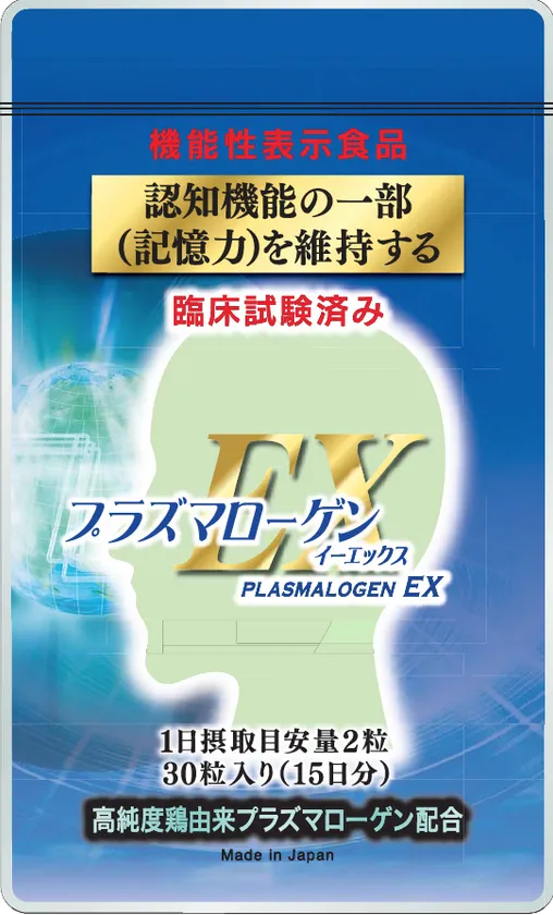 「プラズマローゲンEX」は、認知機能の一部である記憶力を維持する製品です。機能性関与成分として、「鶏由来プラズマローゲン」を配合しています。臨床試験は無作為化プラセボ対照二重盲検並行群間比較試験により実施されました。これは、トクホが行う臨床試験と同じ方法です。ランダムに抽出された被験者をテスト製品を摂取する群と機能性関与成分(鶏由来プラズマローゲン)を含まないプラセボ群に割振りし、実施している内容を医師(観察者)からも被験者からも不明にして、プラセボ効果や観察者バイアスを防ぐ方法です。健康な40歳から77歳までの75人に対して上述の臨床試験を12週間行い、科学的根拠を実証しました。この臨床試験については、論文化され、2016年12月に査読付きで医学雑誌に掲載されました。健常者に対するプラズマローゲンの臨床試験論文は、他に例はありません。