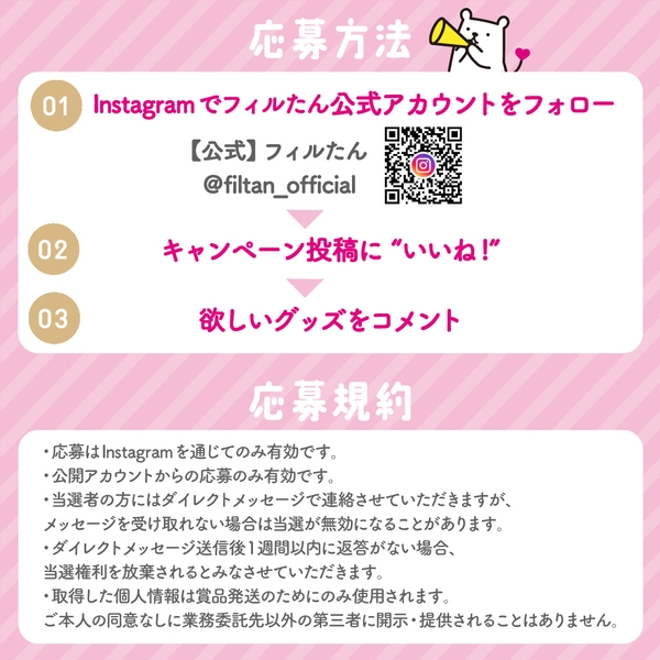 当選の方へ、下記Instagramフィルたん公式アカウントよりダイレクトメッセージにてご連絡させていただきます。