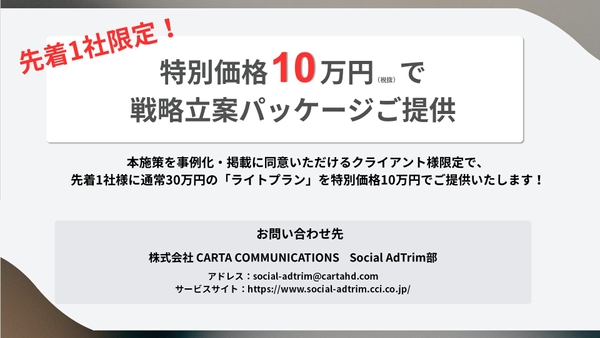 株式会社CARTA HOLDINGSのグループ会社である株式会社CARTA COMMUNICATIONS(東京都港区、代表取締役社長:目黒 拓、以下「CCI」)は、企業におけるSNSマーケティングの課題解決を提供するコンサルティングサービス「CCI Social AdTrim」において、企業様のSNS運用の戦略設計をサポートする「SNS戦略立案パッケージ」の提供を開始いたしました。本パッケージは、すでにSNSを活用している企業様、これからSNS運用を開始する企業様に向けて、SNS運用に必要不可欠な「目的の整理」「KPIの設定」「振り返り方法」などの運用戦略を、CCI Social AdTrimのSNSコンサルタントが、企業様に合わせて作成し、ご提案するプランとなります。