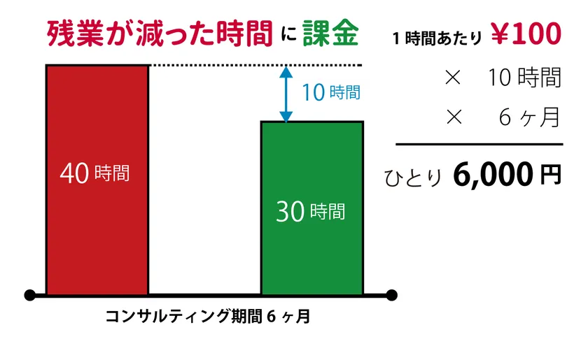 新料金プランは、コンサルティング前の平均残業時間から終了時の減った残業時間に100円(税別)を乗じた額を1ユーザあたりの月額料金として請求するため、残業が減らせずに成果が出なかった場合は無料になります。なお、本プランの提供は、ワークライフバランス研修の受講が条件で、研修費用は助成金を活用すれば負担が少なくなります。この新料金プランで2018年は年間10万時間の残業を削減し1,000万円の売上を目指します。
