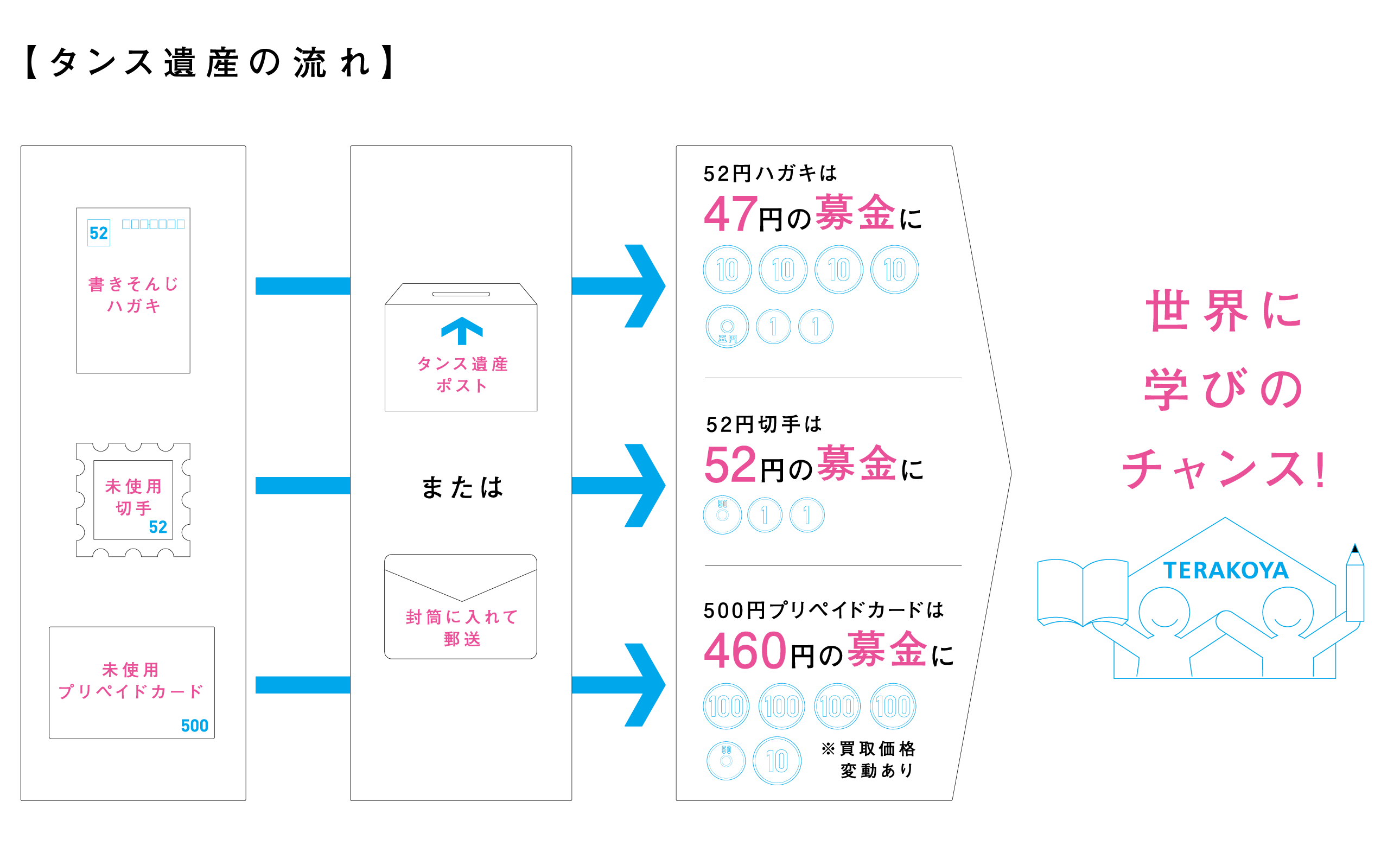 書き間違えや、古くて使用しないなどの理由で投函されていない未使用ハガキを回収するキャンペーン。キャンペーンを通じて集まったハガキを募金に変え、寺子屋運動の展開に使用しています。