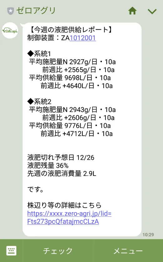 毎週月曜日に先週1週間の「各系統の液肥供給量や施肥量レポート」がLINEで届きます。