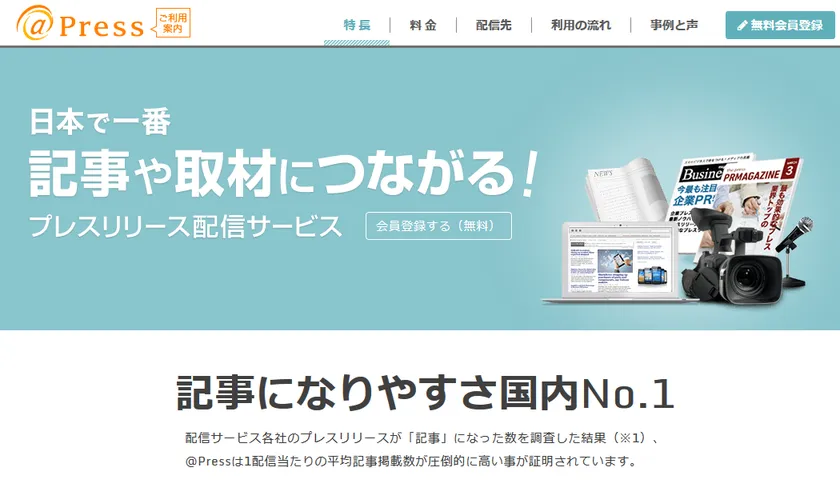 「アットプレス」は、累計17,000社超の企業や地方自治体が利用しているプレスリリース配信サービスです。全産業・地域に対応しており、現在10,000以上のメディアリストを保有し、プロスタッフによる原稿校正や配信先メディア選定を行うことで「日本で一番記事になる」※ことを実現している企業 PRを支えるサービスです。