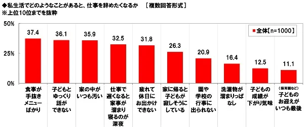 全回答者(1,000名)に、私生活でどのようなことがあると仕事を辞めたくなると感じるか聞いたところ、「食事が手抜きメニューばかり」が最も多く37.4%となり、次いで「子どもとゆっくり話ができない」が36.1%となり、僅差で「家の中がいつも汚い」(35.9%)が続きました。仕事で家事や育児を充分にこなせなくなる状態が続くと、仕事を辞める選択肢が頭をよぎるワーキングママも多いようです。また、「仕事で遅くなると家事が溜まり寝るのが深夜」(32.5%)、「疲れて休日にお出かけできない」(31.8%)など、仕事と家事や育児の両立で“体力の限界”を感じるような出来事も割合が高くなりました。