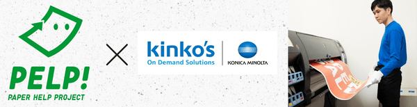当社は、2021年8月に紙資源の再生ネットワーク「PELP!(ペルプ)*1」の会員となり、会員パートナー企業から出た不要な用紙を回収し再生した “PELP!PAPER”を、自社従業員が使う名刺や封筒に利用しています。同年から顧客向けにも、名刺および封筒印刷でPELP!PAPERをラインアップに加えていましたが、環境保全意識の高い顧客からのニーズに応え、今回ポスターなど大判サイズまで取り扱いを拡張しました。これにより、当社が運営するキンコーズ店舗で提供するオンデマンドプリントサービスにおいて、全てのサイズ(A4~A0、B5~B0)で再生紙「PELP!PAPER」の提供が可能となりました。 また、販売のみならず、キンコーズ店舗内で掲示している販促ポスターも順次、PELP!PAPERに切り替え、自社実践の展開も拡げていきます。