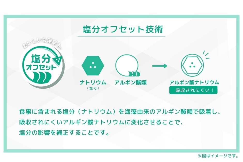 当社が独自に開発したこの「塩分オフセット技術」は、海藻由来の食物繊維アルギン酸類を用い、食事中の塩分(ナトリウム)を胃の中で吸着し、吸収しにくい形に変えて、最終的に便として排出するという新しいメカニズムに基づいています。これにより、味を変えることなく、実質的に“減塩”の効果を得ることが可能です。またカリウム制限のある方にも安心してご使用頂くことができます。
