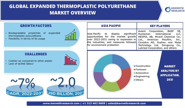 膨張熱可塑性ポリウレタンの生分解性特性は、環境を保護し、他のプラスチックのより良い代替品になります。さらに、さまざまな業界でのE-TPUの使用に関する柔軟性は、世界的な拡大した熱可塑性ポリウレタン市場の成長。