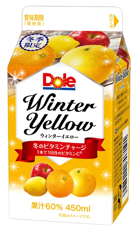 『Dole(R) Winter Yellow』は、冬のビタミン補給ニーズに応える、柑橘フルーツ(グレープフルーツ、オレンジ、レモン)をミックスした果汁飲料です。1本(450ml)で1日分のビタミンC※を摂取できます。酸味をきかせ、ビタミンチャージを実感できる味わいに仕立てました。