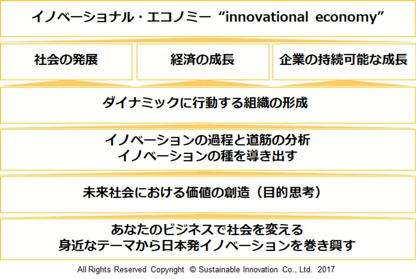 イノベーショナル・エコノミーというコンセプトにより、事業を起こすという発想からイノベーションを巻き興すという発想への転換を図って参ります。企業にとって真に目指したいことこそが最も大切にすべきことで、その目指したいことが未来社会においてどんな価値を創造しうるかをストーリーとして描きます(目的の明確化とビジョンの策定)。