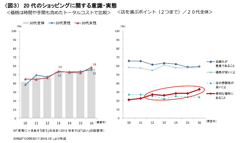 若者の消費意識・実態をみると、女性の買い物好きは一般的によく聞きますが、この 30年で男性若者でも7割近くが買い物好きになっていることがわかりました。ショッピングの意識・態度をみても、時間や手間も“価格”を含めたコストパフォーマンスとして考える意識が高まり、「便利な場所(アクセスに時間のかからない場所)」にある店を選ぶようになっています。スマホの普及でネットショッピングも利用しやすくなり、男性でも手軽に身近にショッピングができるようになったことが窺えます。
